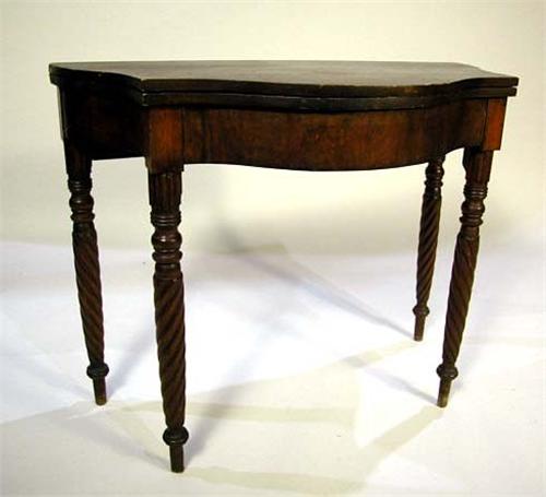 A FEDERAL MAHOGANY SERPENTINE FRONT GAMES TABLE; North Shore, Massachusetts, with spiraling reeded legs and peg feet (restored) 29"h x 36 1/2"w x 18 1/2"d