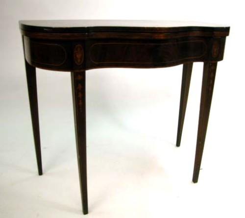 A FEDERAL STYLE INLAID MAHOGANY GAMES TABLE; American, the serpentine shaped top above a similarly shaped line and urn inlaid frieze and ending in square tapering bell flower inlaid legs 29"h x 35"w x 17 1/2"d