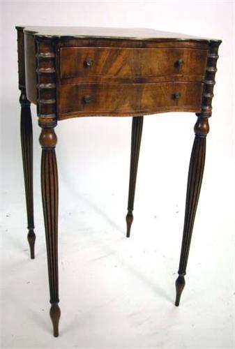 A FEDERAL STYLE INLAID MAHOGANY SERPENTINE TWO-DRAWER WORK TABLE; On reeded legs with peg feet 29 1/2"h x 16"w x 16"d