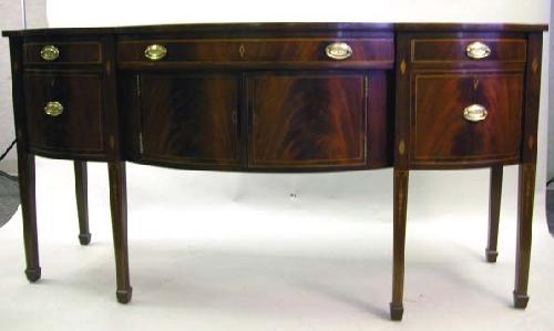 A FEDERAL STYLE INLAID MAHOGANY SIDEBOARD; a National Trust for Historic Preservation by Kindel, Grand Rapids, with five drawers centering cupboard doors, inlaid with diamonds, stringing and graduated husks ending in spade feet, 38"h x 6'4"w x 26"d