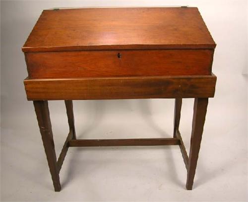 A FEDERAL WALNUT SLANT FRONT TABLE TOP TRAVELING DESK-ON-FRAME; American, of typical form with pigeonholes and short drawers on a frame of a later date. The inside of the lid bears a label which suggests this desk was used by Lafayette when he was at an inn near Trumbull, Connecticut (repairs), 42 1/2"H x 38"W x 25 1/2"D.