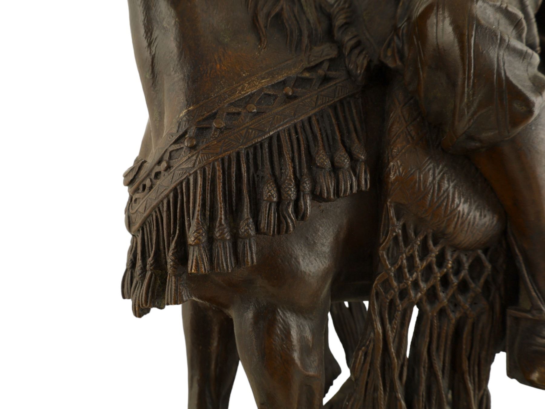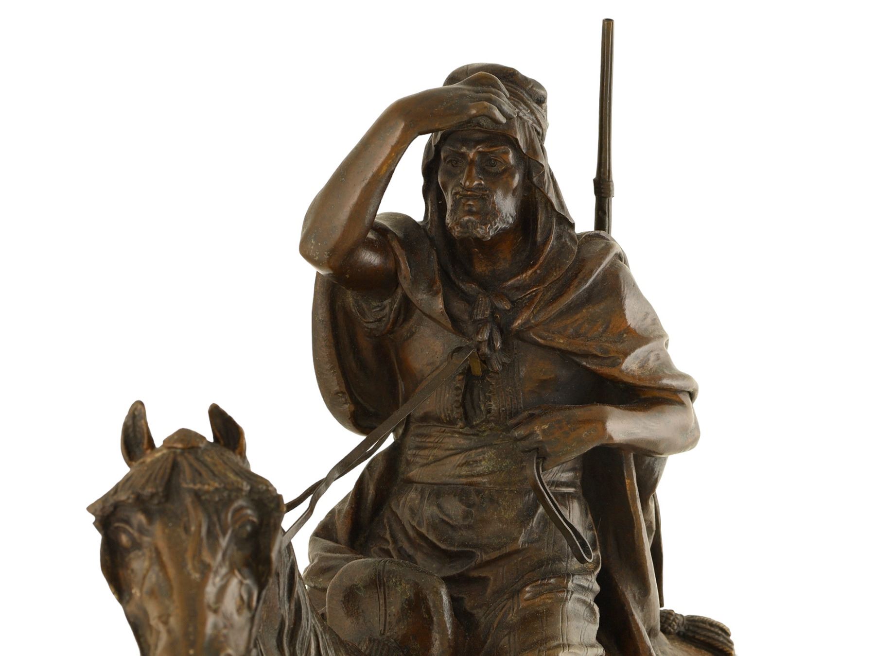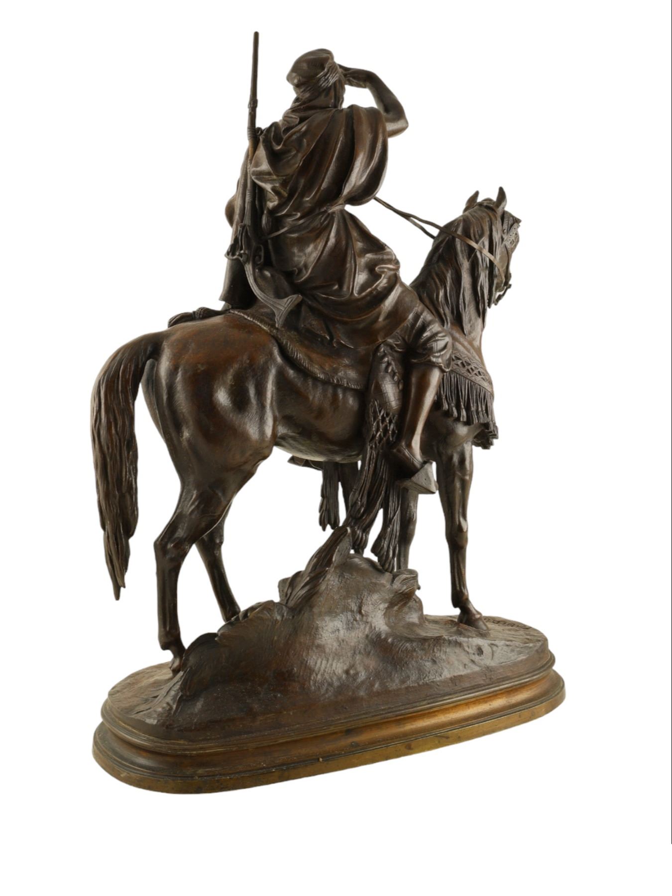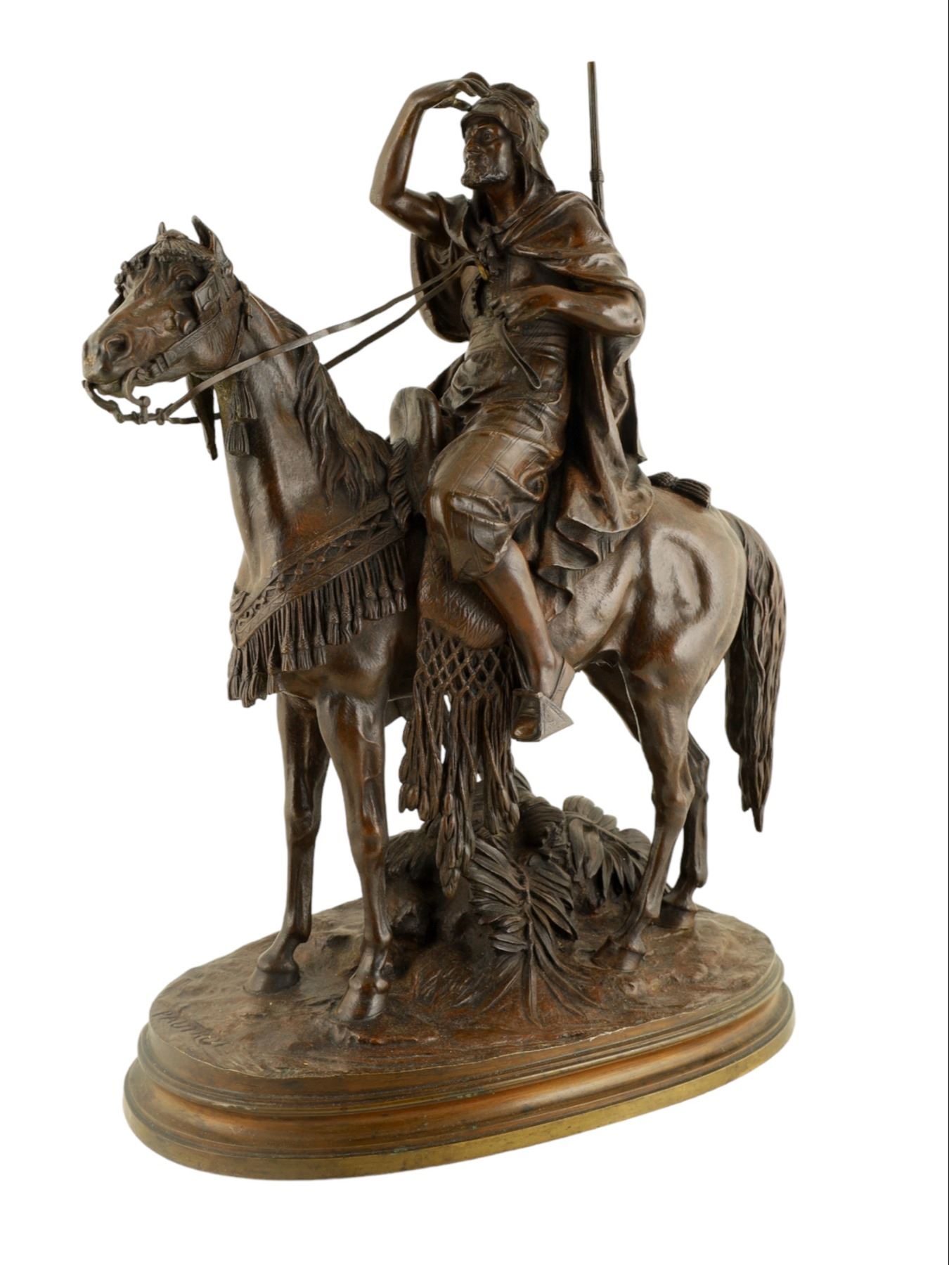 A patinated bronze sculpture titled "Arab Man on Horseback" by Ferdinand Pautrot, (French, 1832-1874). Signed on the base "PAUTROT".