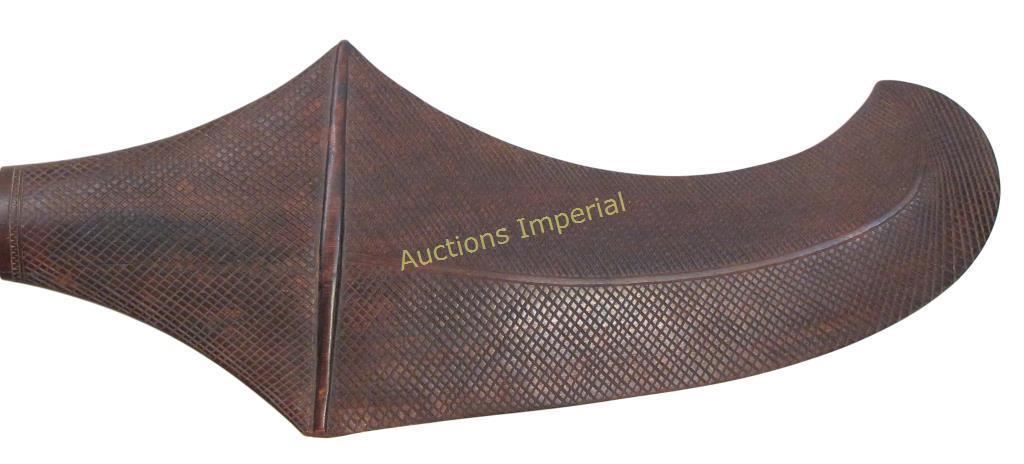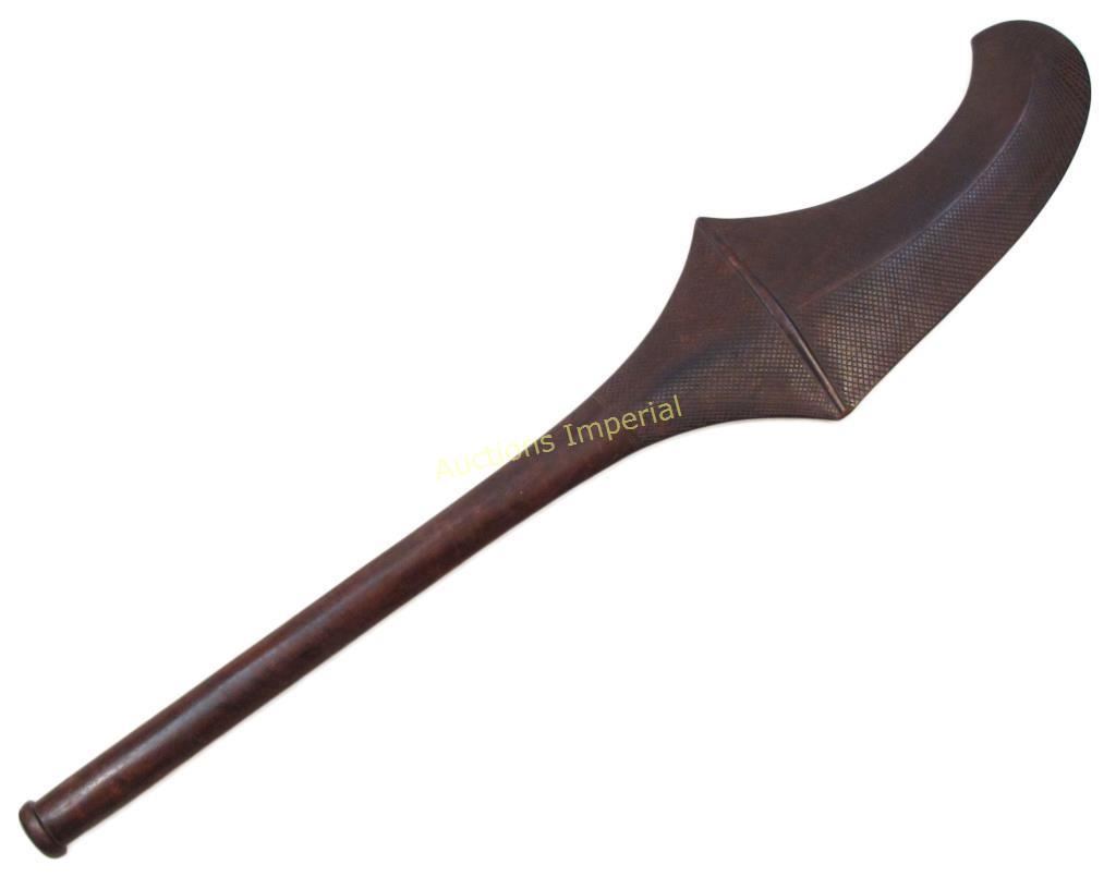 A massive example with broad, flat, symmetrical head terminating in upswept hook with central ridge rather than the typical paddle, incised overall, with three sections of geometrical designs to each side, showing the hand of a skilled craftsman. The long grip terminating in a flattened knob. Mid 20th century. Chipped terminal. Overall length 104.5 cm.