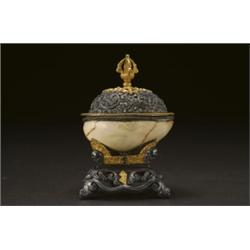 fashioned from a monkey skull, the diminuitive bowl fitted with with a silver liner and a domed silver cover worked with tendrils and finished with an everted wave pattern rim, the cover