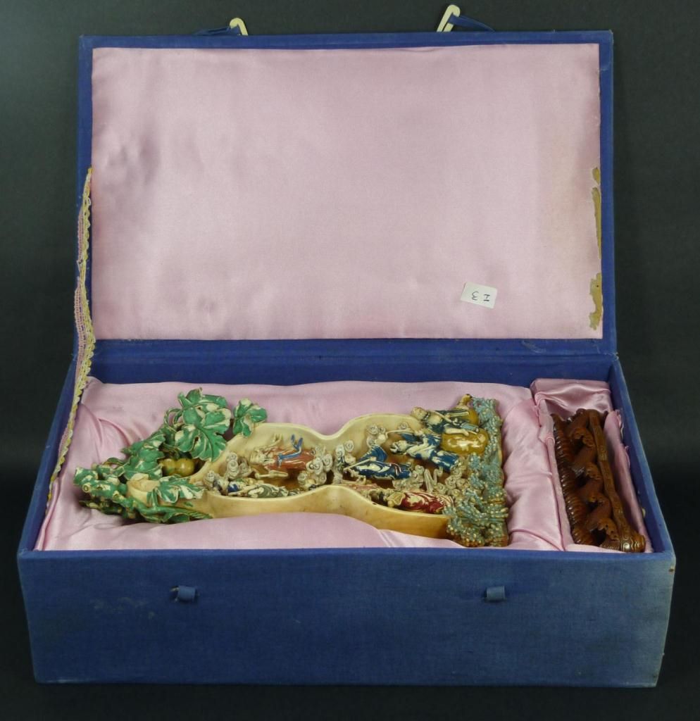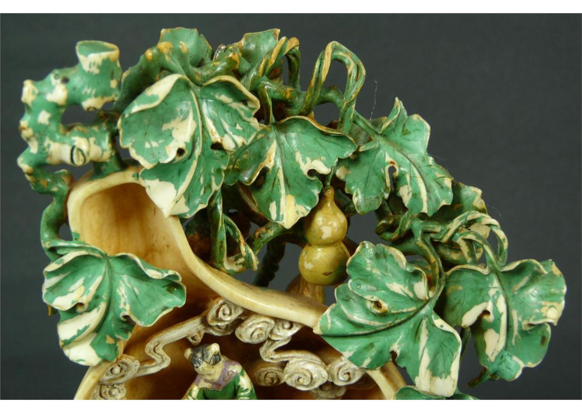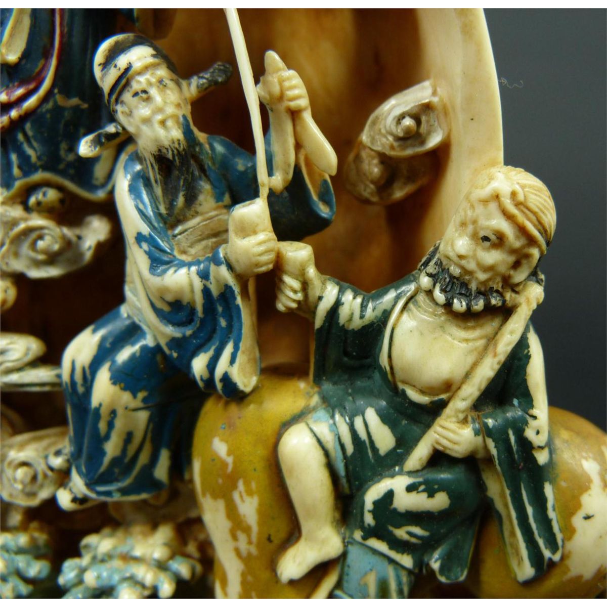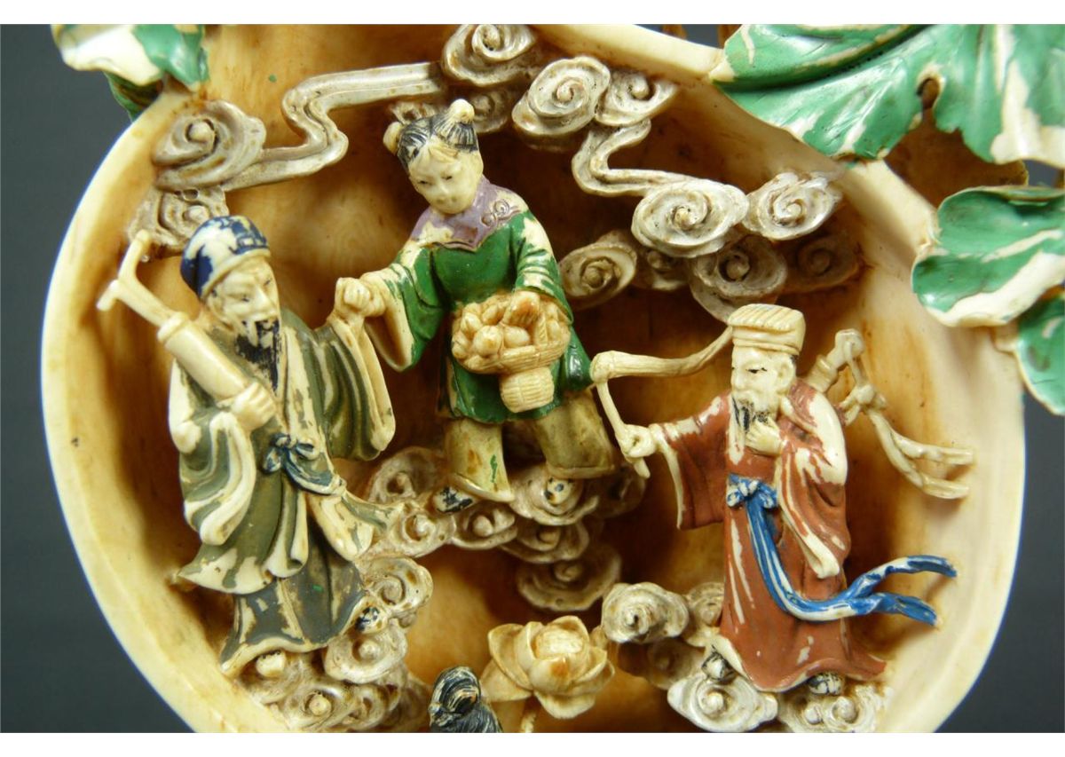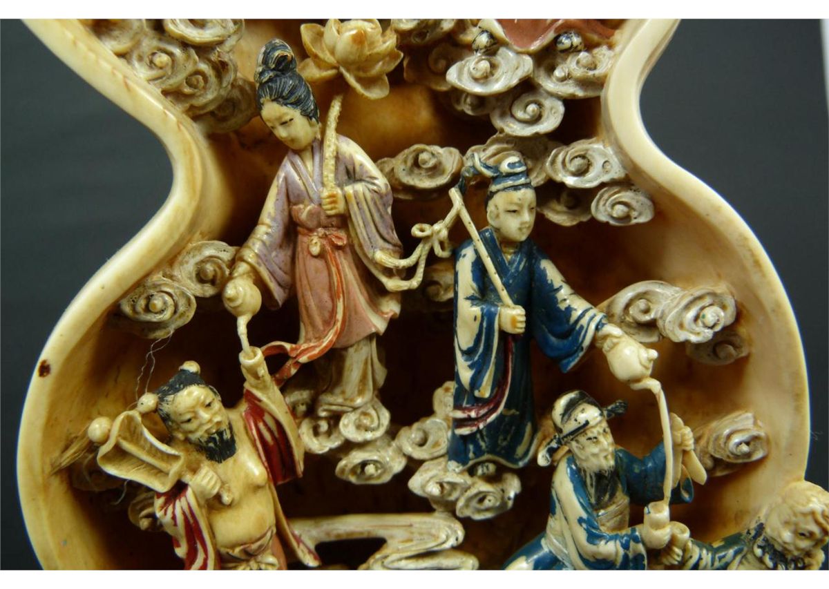A stunning and finely carved antique Chinese relief ivory figural double gourd sculpture. Intricately crafted to depict the eight immortals to interior amongst clouds. Top of hulu has root and vine design with leaves. Vividly polychromed throughout. Circa mid to late Qing dynasty period. Includes fitted wooden silver inlay base. Includes fitted silk line presentation box. Measures 9 1/4" height x 5 1/4" width (23.4cm x 13.3cm). Total ivory weight of 576 grams.