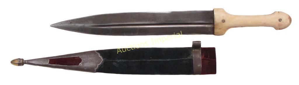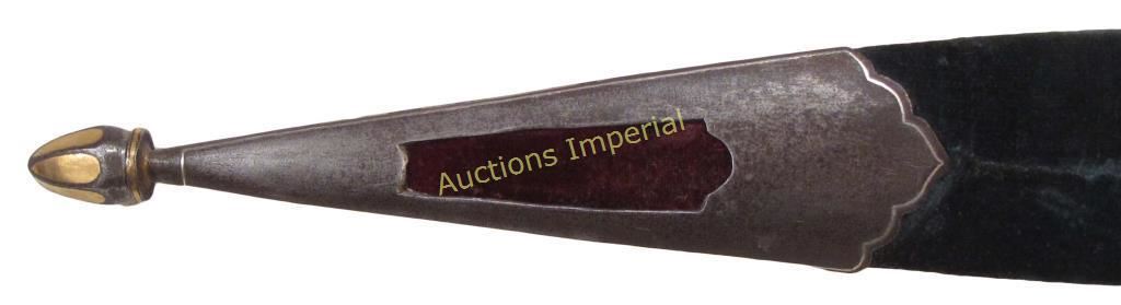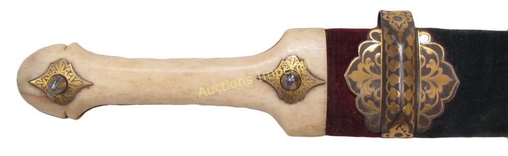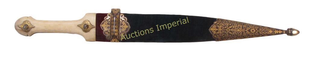 A superior example with polished staghorn grips and velvet-covered wood scabbard, the profiled steel mounts finely inlaid in gold. The blade forged of rare black wootz steel and inlaid with the owner’s name in gold Mkhedruli characters, D. KANDIURI. Mid-19th century. Overall length 37.7 cm.