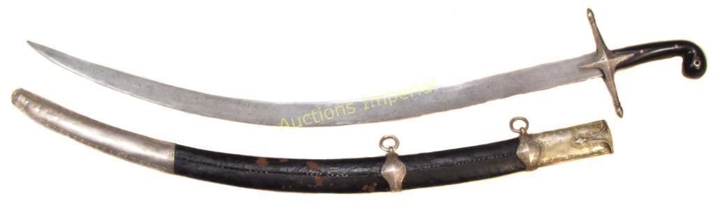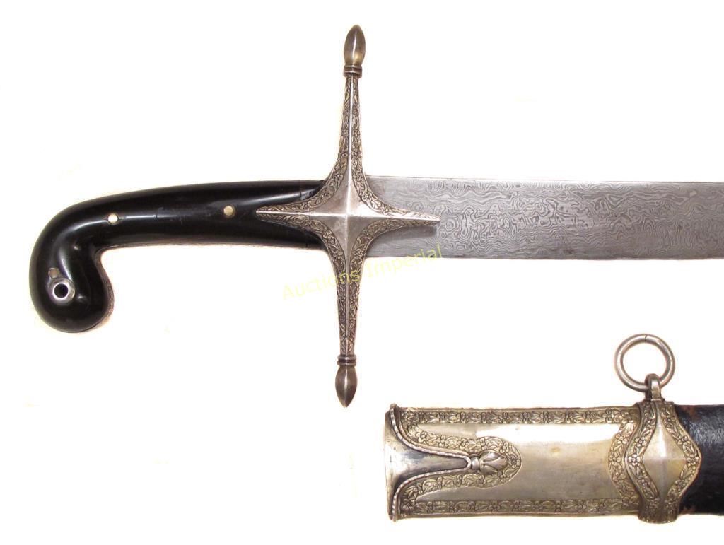 The polished horn grips with rolled pommel, the silver tangband and guard with borders richly chiseled in flowering vine motifs. With broad blade of typical form, displaying a skilfully-wrought and dramatic pattern-welded damask. In its leather-covered wooden scabbard with wire-bound seam, the fine silver mounts with finely-chiseled borders en suite with the hilt, with areas of gilding intact. Latter 18th century. Wear to leather. Ex-Ryszard Janiak Collection, Poland. Overall length 91.2 cm.