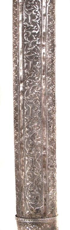 The grip elaborately carved as a naga-head, with superbly embossed and engraved ferrule. The straight, single-edged blade with expanded tip dramatically pattern-welded.In its fine embossed and engraved silver scabbard with flared locket, depicting a dragon amid panels of scrolling foliage.First half of the 19th century.Overall length 54 cm. Condition I