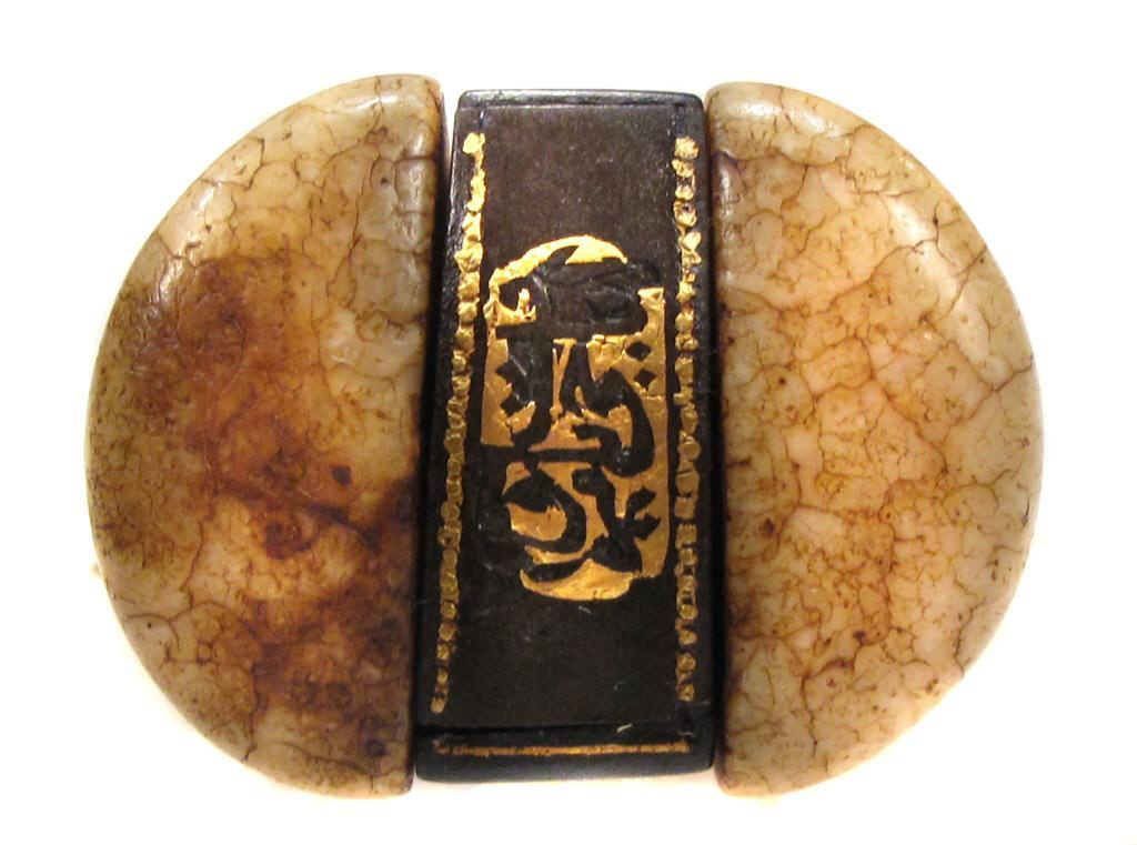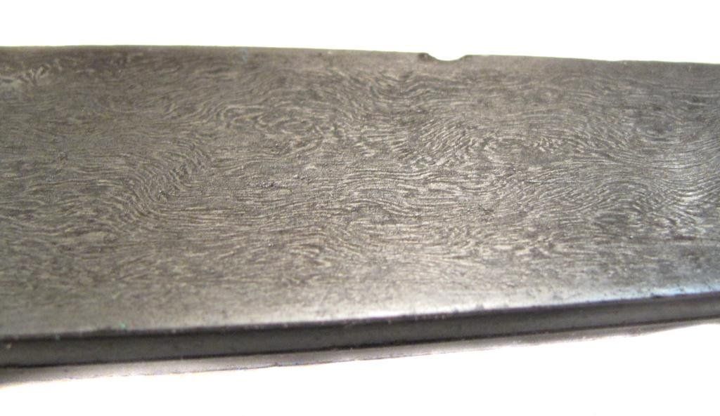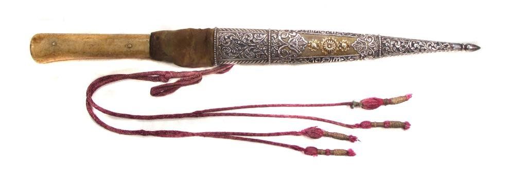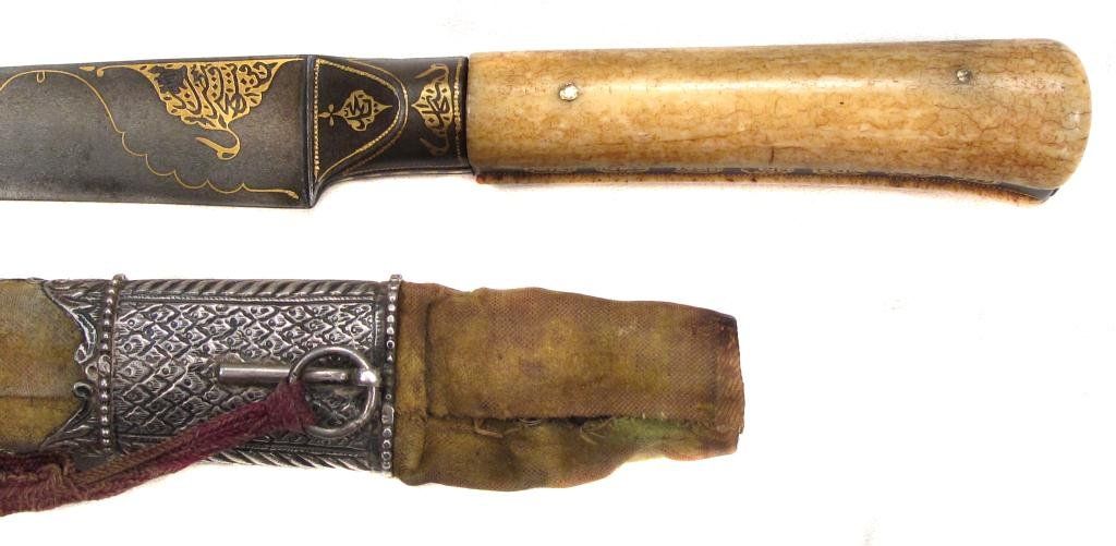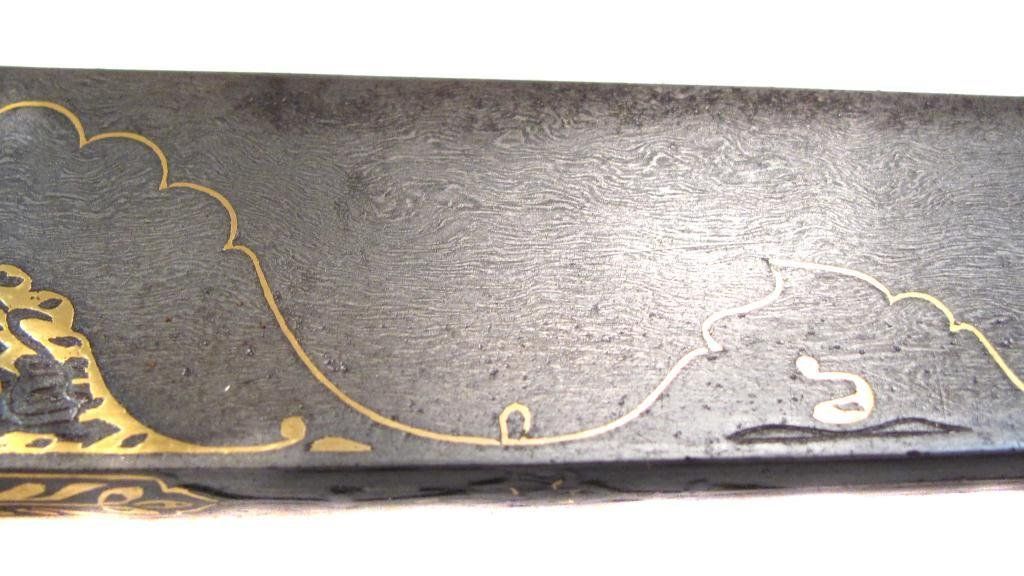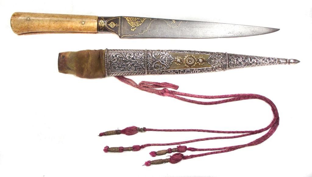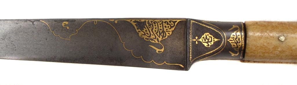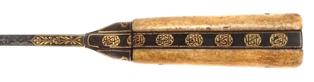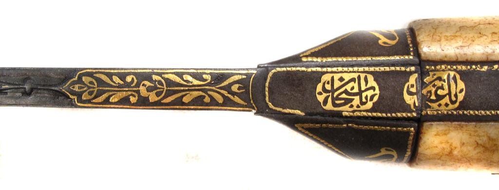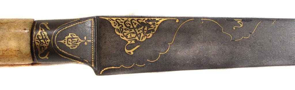 An example of superior quality with walrus grips, the tangbands and bolster forged of fine wootz steel, true-inlaid in gold with cartouches containing attributes of the Almighty. The single-edged blade with finely-chiseled spine, inlaid in gold at the forte, and forged of Persian Kara Taban (Brilliant Black) wootzdamascus steel with original lustre. In its velvet-covered wooden scabbard with superbly pierced, embossed and engraved silver mounts, together with a gold or gilt floral applique. Retains its woven silk tassels.Mid- 18th century.Overall length 43 cm. Condition I