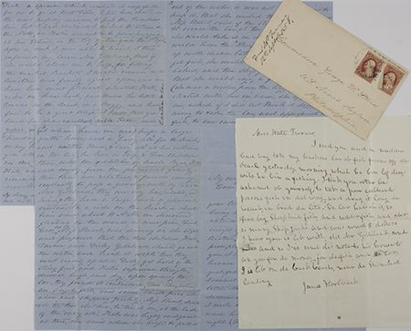 A good antebellum Southern travel letter, 8pp. 4to., by a Mrs. Turner, "Sullivan's Island, next door to Fort Moultrie, Sept. 7, 1856" to Comm. George W. Storer concerning her stay on Sullivan's Island during the summer of 1856: "…We find most agreeable neighbors in Col. & Mrs. [John H.] Winder [future CSA general] and their daughter…it is comfortable to be so near the fort in case of the severe gales…we can seek protection there…the steamers ply between this & the city almost every day and the cars pass directly by our gate. 'The Moultrie house', it is a fine hotel…we have very pleasant rides on the beach almost every day...Charleston is about a half hours journey in a steamer from this Island. The Yellow fever is still here …". Also included in the letter is Mrs. Turner's account of a case of fish she and her children found in the surf one day. The decision to keep the fish greatly upset her young teenage daughter who piously declared that they shouldn't keep the fish because it belonged to someone else. Needless to say, they keep the fish and eat it much to her daughter's dismay and to play a joke on her daughter she concocts a story that the owner of the fish, a local black woman named Jane Horlback, had sent the girl a letter asking for money for the lost fish. That letter is also included in the lot and comically reads, in part: "Miss Kate Turner, I seed you, and a nudder bad boy tek my husbons case ob fish off de beach…I think you otter be ashamed ob yourself, to tek a poor cullered persons fish in dat way, and drag it long de beach in brod da lite. De can hab it…was wort 5 dollers. I hear you is lib with Old Mr. Gilliland and and so I'is send dis note to his house to ax you for de money for de fish…". Also included is the original stamped transmittal cover, Near fine.