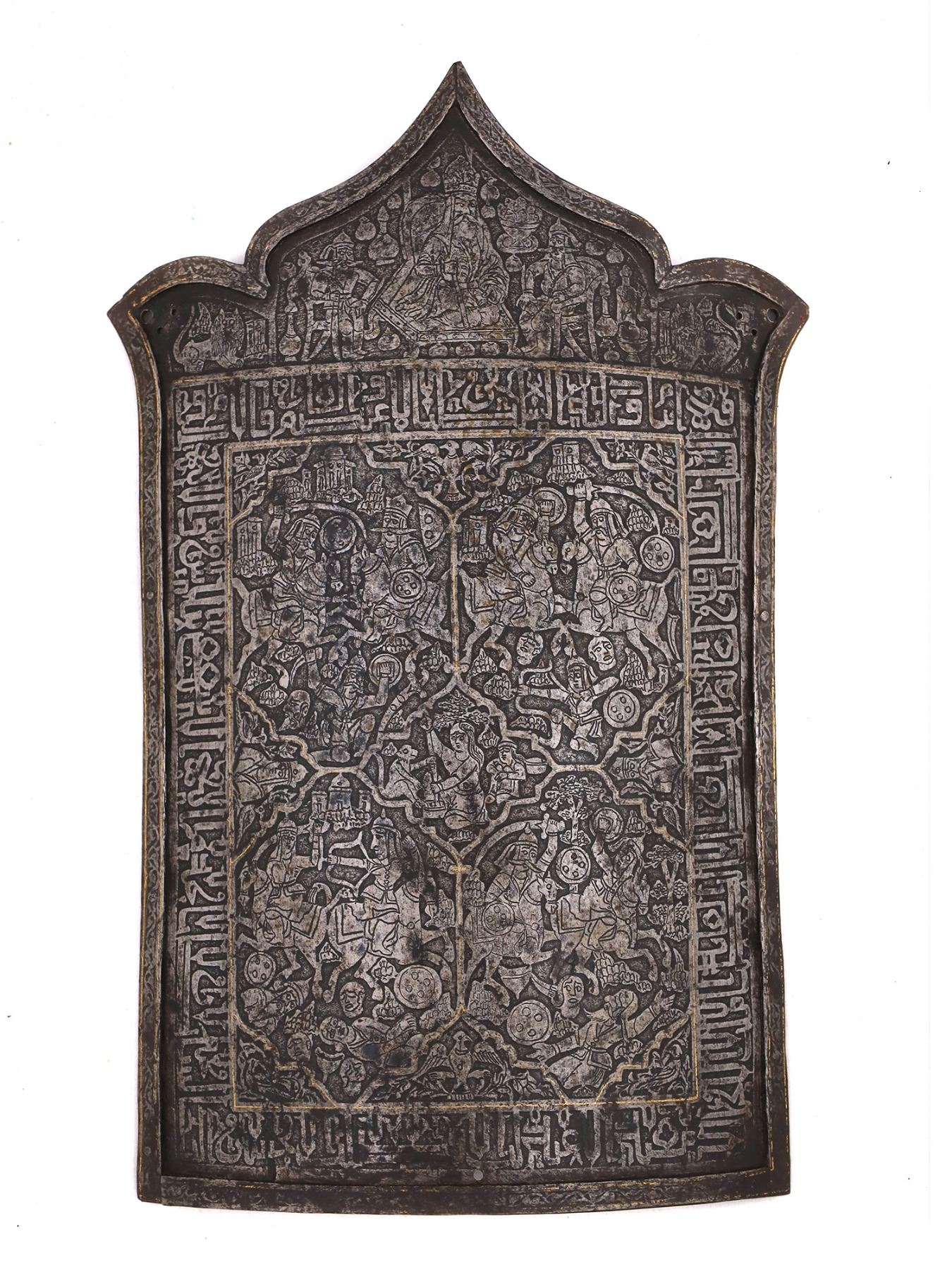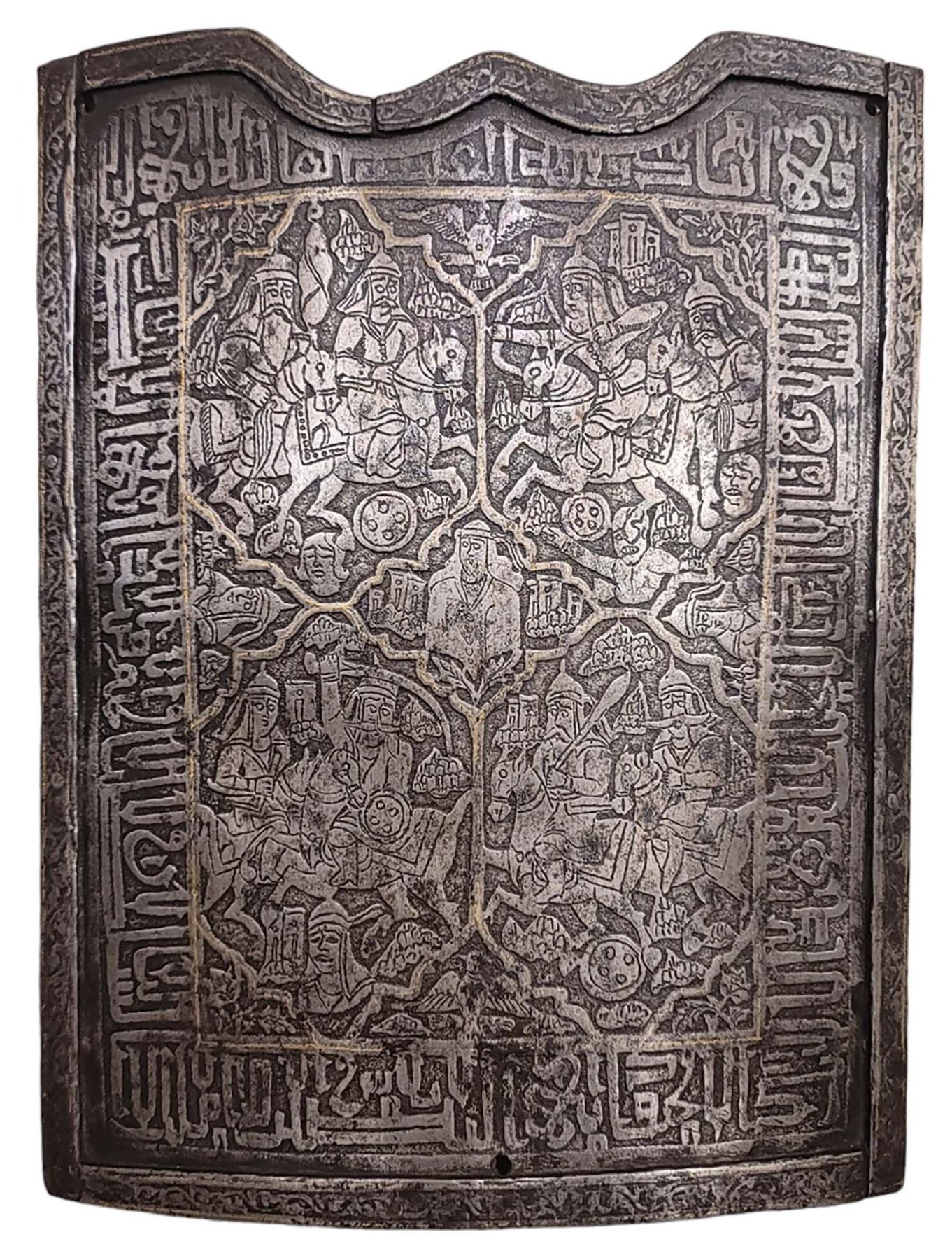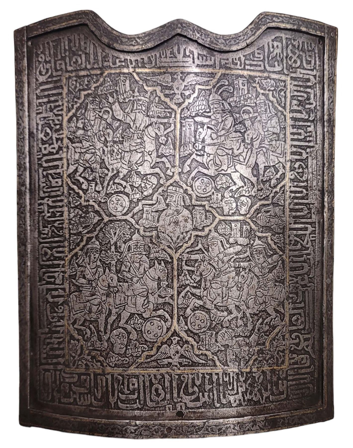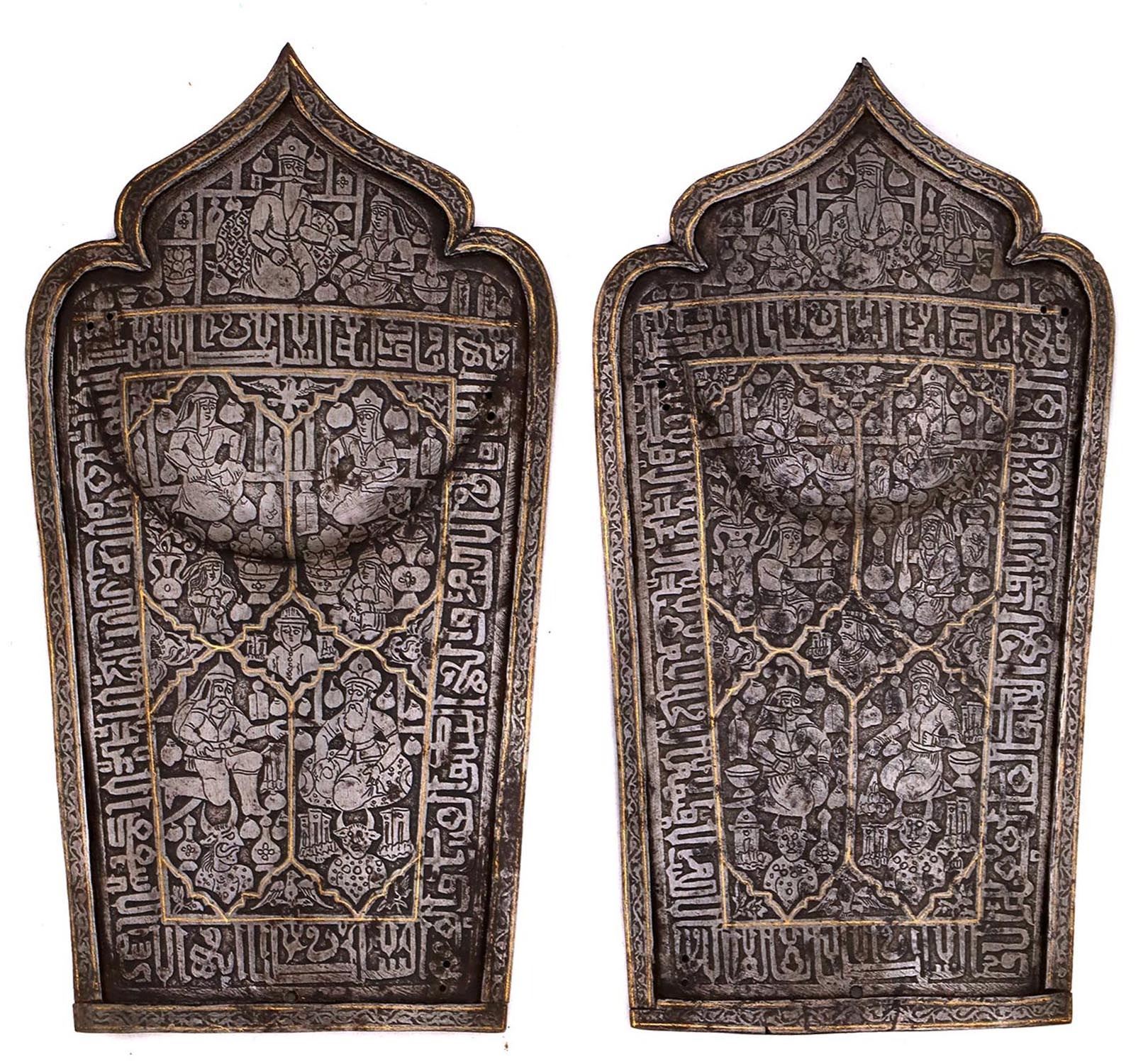 Five plates of Chahar-aina armor, Qajar Period, Iran, 19th-century. The armor plates are known as "with four mirrors" made of etched steel, chiseled and inlaid with gold. The set consists of three plates for the chest and the sides of the torso, and two plates for the legs. The plates are decorated with etched medallions (cartouches) depicting scenes from Shahnameh, bordered by an epigraphic frieze in Kufic script.