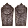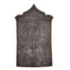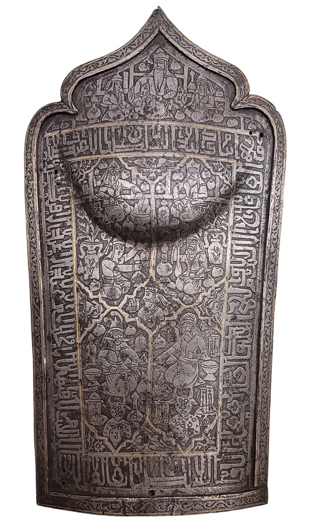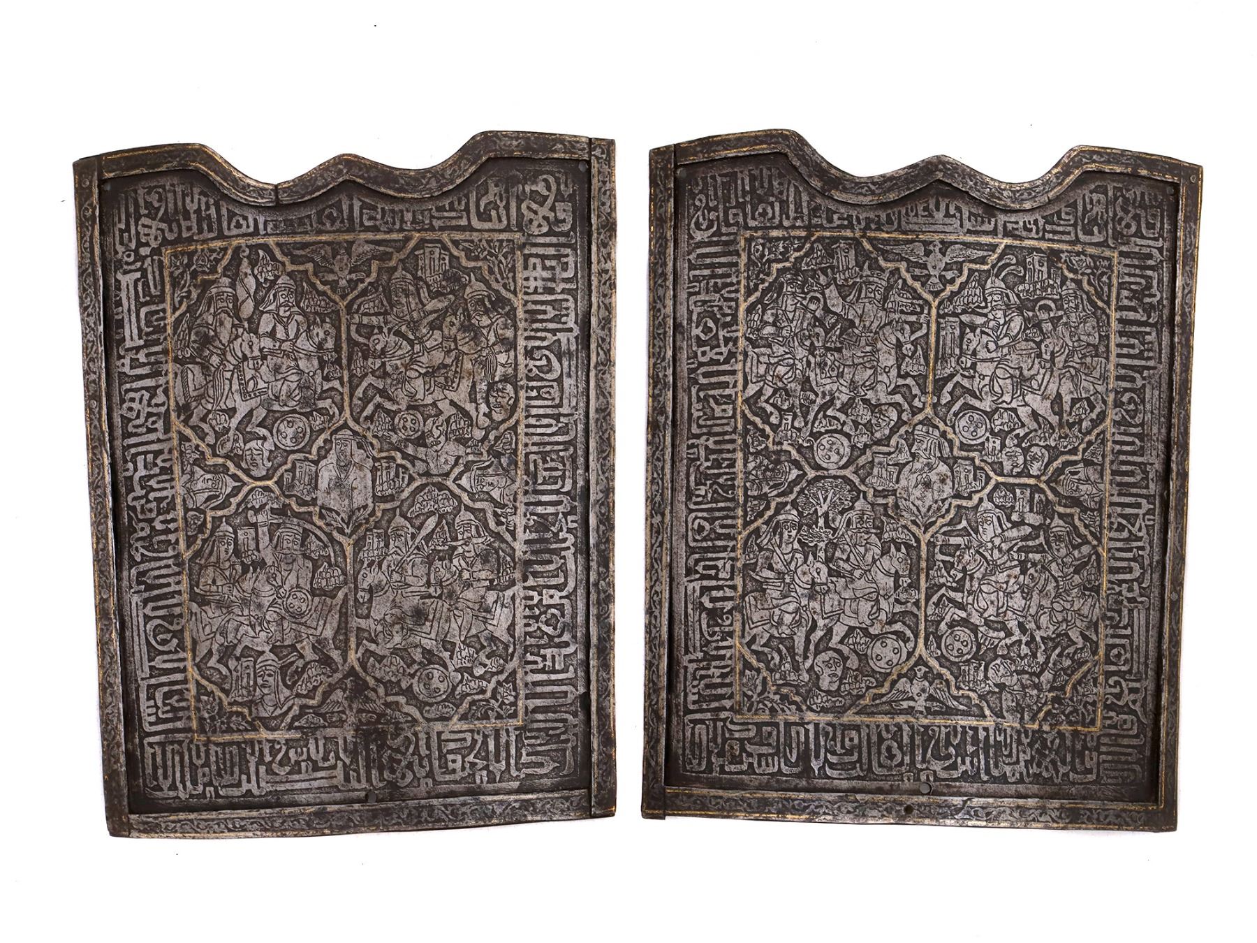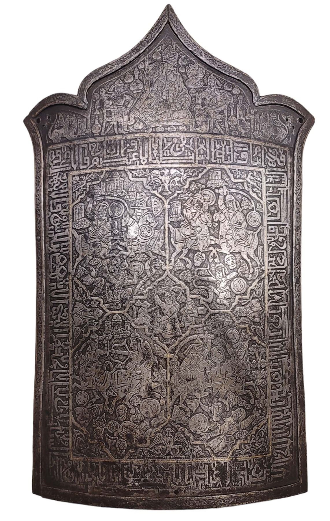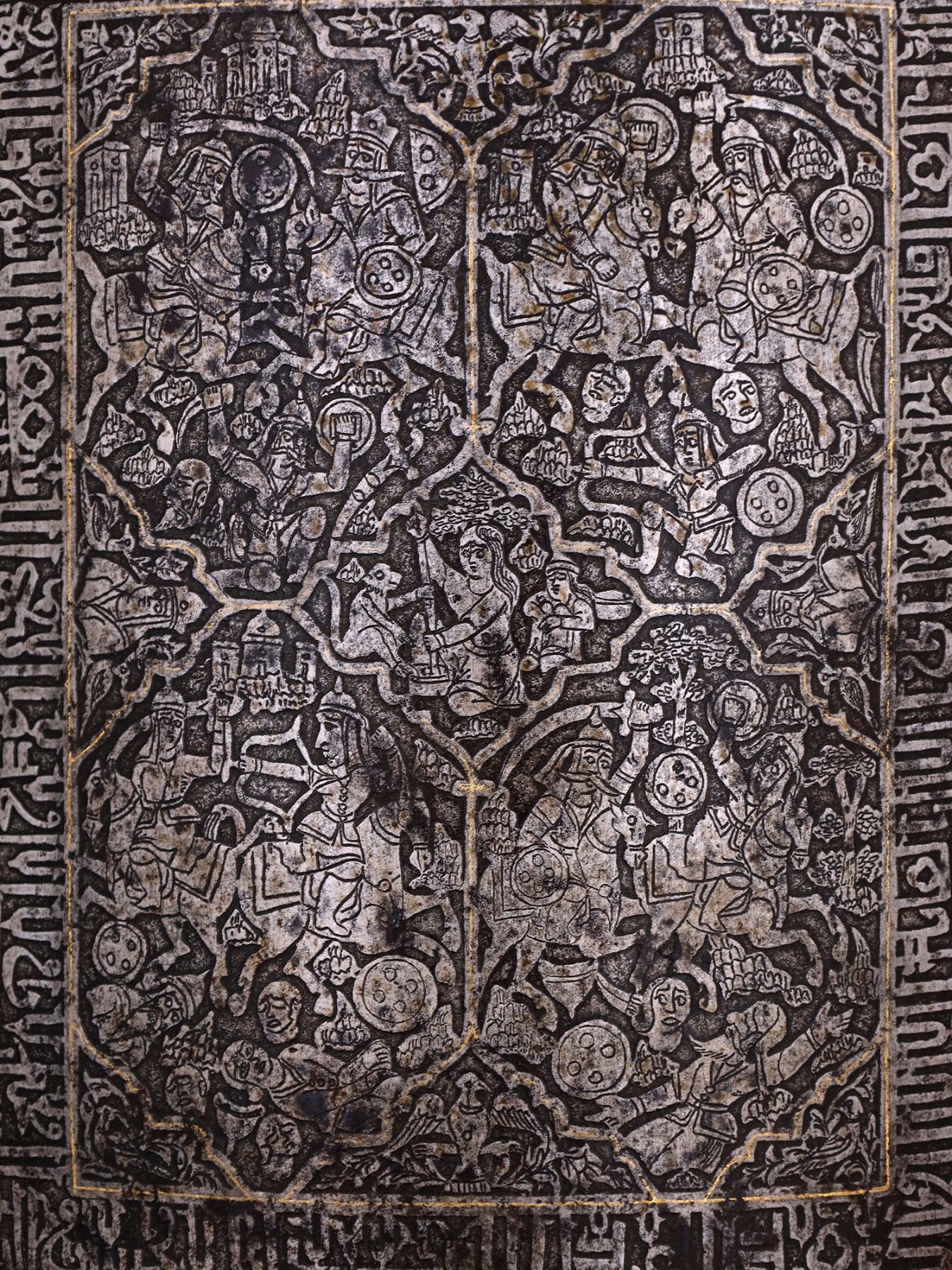 Five plates of Chahar-aina armor, Qajar Period, Iran, 19th-century. The armor plates are known as "with four mirrors" made of etched steel, chiseled and inlaid with gold. The set consists of three plates for the chest and the sides of the torso, and two plates for the legs. The plates are decorated with etched medallions (cartouches) depicting scenes from Shahnameh, bordered by an epigraphic frieze in Kufic script.