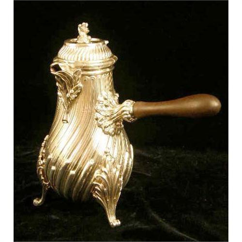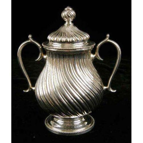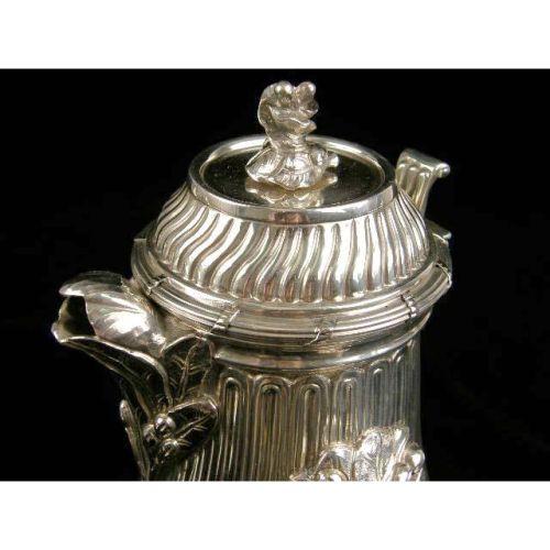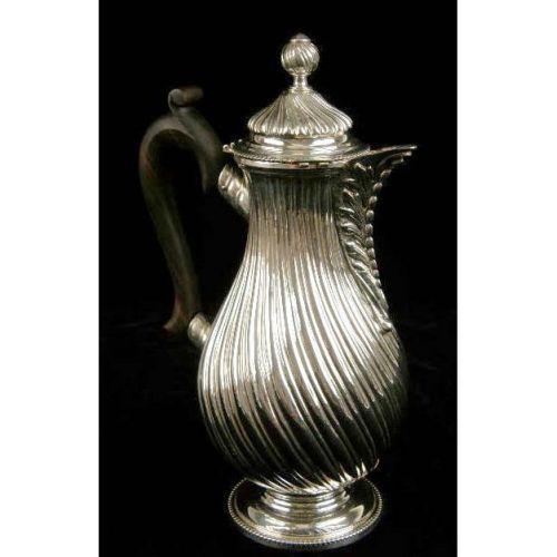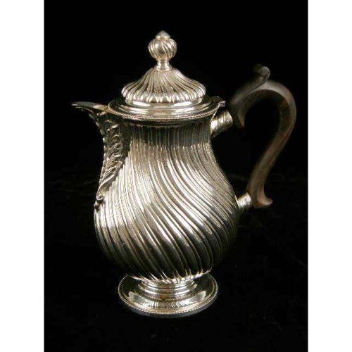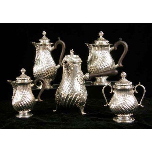 A FIVE PIECE TIFFANY & CO, PORTUGAL STERLING SILVER TEA SERVICE<BR><BR>Comprising a coffee pot, teapot, chocolat hot, 9-3/4"high, all with wooden handles, a covered sugar bowl, and covered cream jug, all0over swirled rib body with acanthus spout decoration, on circular foot, total weight 95 T.O.