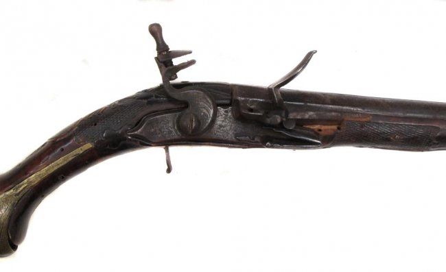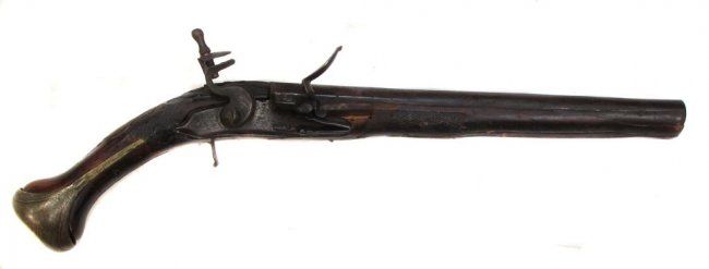 With carved hardwood stock and brass furniture.Mid-18th century. Worn overall, triggerguard, button lacking. Overall length 48.7 cm.