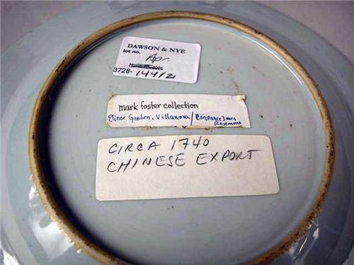 The label on verso reads "The Mark Foster Collection-Elinor Gorn, Villanova, Constance Jones-Rosemont, circa 1740". Chips on rim.