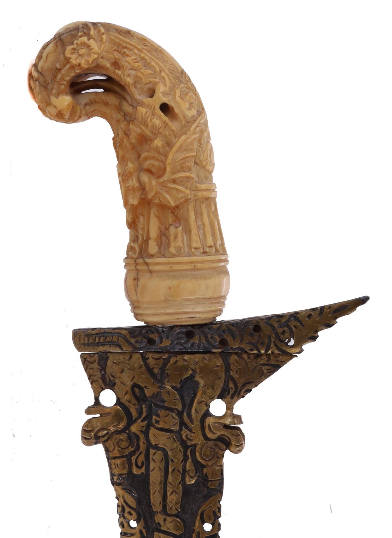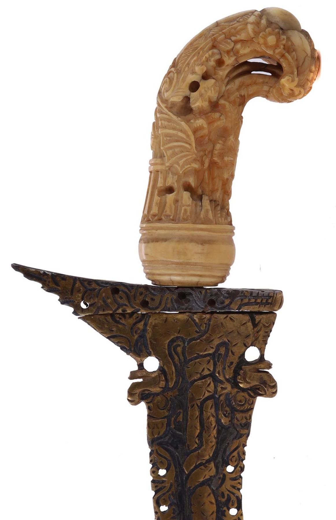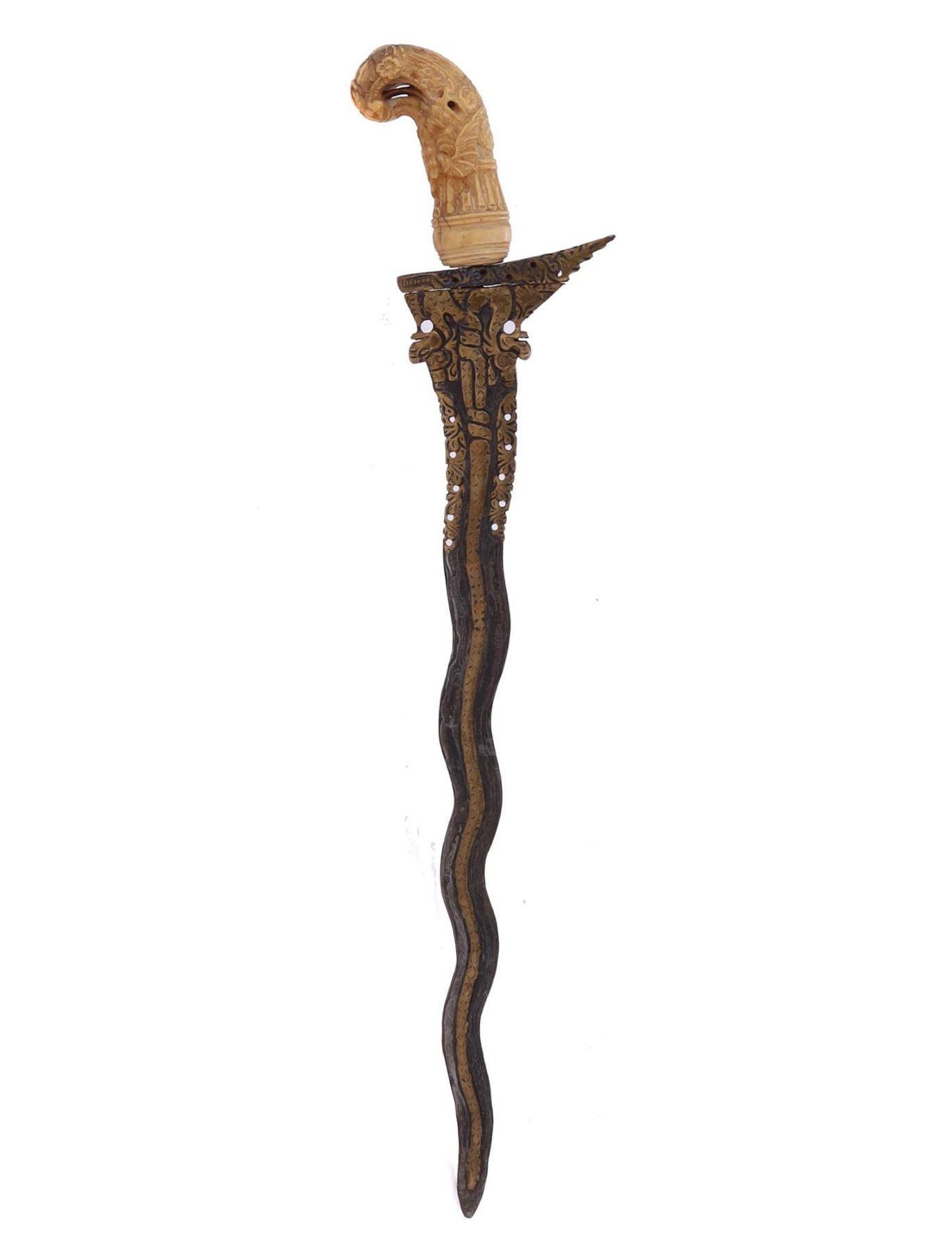 Excellent kris blade. The hand-forged wavy blade is pierced and inlaid with brass. The hilt is of the characteristic form is carved with intricate details.
