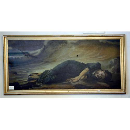 Original high quality oil painting on canvas. There's some holes on canvass that need restoration. Bertrand, James [Jean-Baptiste],On the advice of Alphonse Périn (1798?1874), he then moved to Paris, where he entered the Ecole des Beaux-Arts in 1844 and first exhibited at the Salon in 1857. He worked for 11 years with Périn and his teacher and friend Victor Orsel on decorations for the chapel of the Eucharist in the Church of Notre Dame de Lorette in Paris and in 1854 executed a series of reproductions of work by Orsel. From 1857 to 1862 he stayed in Italy, where he probably met the Nazarenes who had not yet left Rome (Friedrich Overbeck, Gebhard Flatz and Franz Riepenhausen). These were pleasant compositions showing the great heroines of history and the novel, as in the Death of Sappho (1867), the Death of Virginie (1869), the Death of Manon Lescaut (1870) and the Death of Ophelia (1872). These works, widely known through engravings, assured him a certain popularity.This painting would be a wonderful addition to any vintage European art collection!