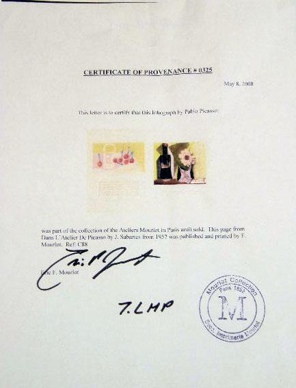 Pablo Picasso, with copy of Certificate of Provenance. 11"h x 12"w