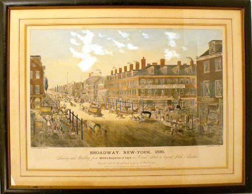 Titled "Broadway, New York, 1836, Showing each building from Webb`s Emporium of Light, Cor. Canal Street to beyond Niblo`s Garden", drawn and etched by T. Hornor, aquatinted by J. Hill. Clouds of a later date, some tears and minor folds. Sightline 20