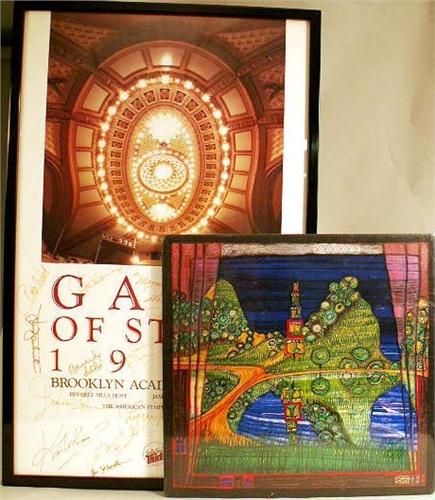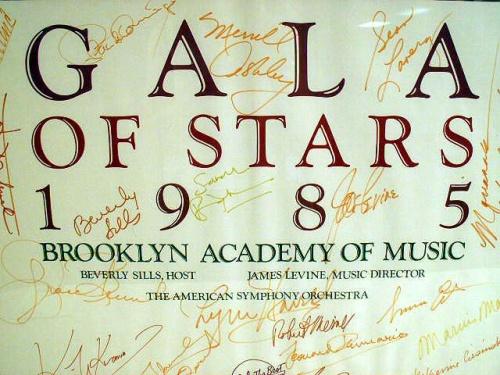 From the "Brooklyn Academy of Music Gala of Stars 1985, Beverly Sills, Host, James Levine, Music Director", signed by Ms. Sills, Mr. Levine, and others. 36"h x 22"w. Together with an abstract polychrome poster. 2 pieces.