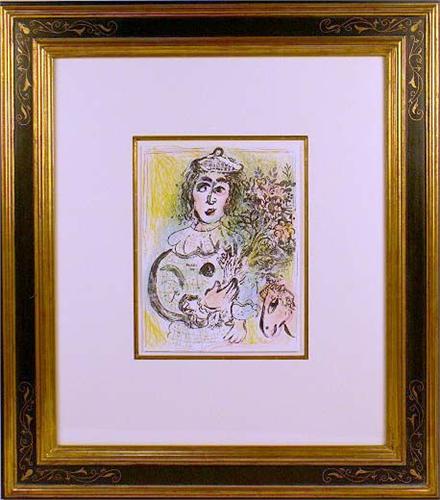 The clown with flowers, accompanied by label stating piece by Marc Chagall, 12"h x 9"w