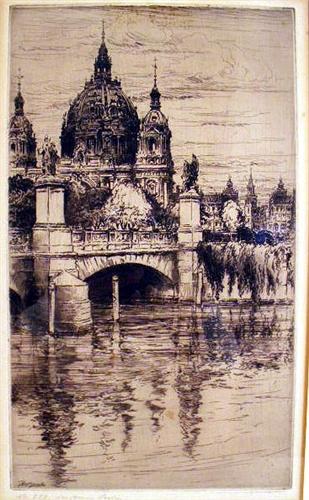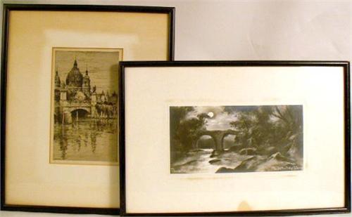 Signed and titled "The Od Wei... Bridge, Killaney". 5 3/4"h x 11 1/4"w. Together with a framed drypoint etching, signed in plate Paul Greissler, edition No. 222. 9 3/4"h x 5 3/4"w. 2 pieces.