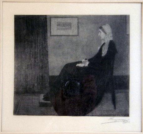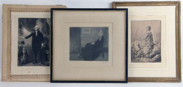 Together with a framed print of "Whistler`s Mother," verso label from M. Knoedler & Co., reproduced by Henry Wolf, signed l.r. in plate and pencil, and a print of George Washington signed l.r. in pencil W.P.H., W. Bickwell. 3 pieces. 10"h x 7"w Scattered light foxing.
