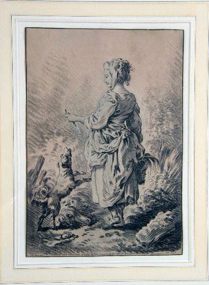 A FRAMED ENGRAVING OF A WOMAN AND HER DOG, "LE JEUNE BERGERE", AFTER HUET