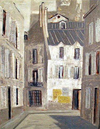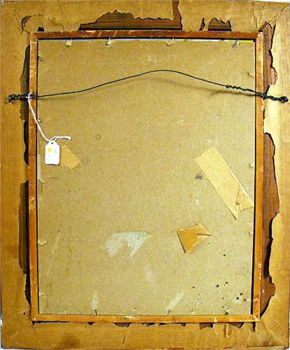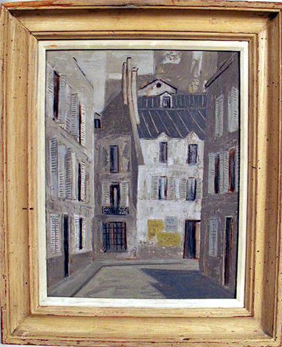 Depicting a French street scene, appears to be unsigned. Some crazing. 17 1/2"h x 13 1/2"w.