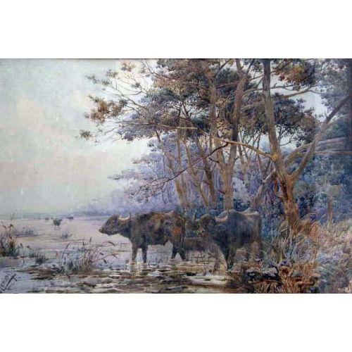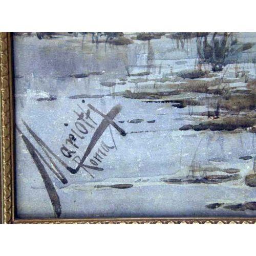 A FRAMED GOUACHE ON PAPER<BR><BR>Depicting a river scene with water buffalo, bears signature Mariotti Roma, (Leopoldo, Italian, 1846-1916) foxing and creases, 26"h x 39"w