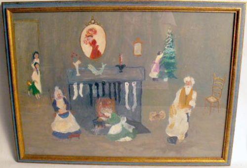 Depicting a fireside holiday scene, bears initials lr BBT, the verso inscribed "ca 1958 Billie Thomas". 13"h x 18 1/2"w.