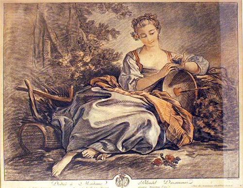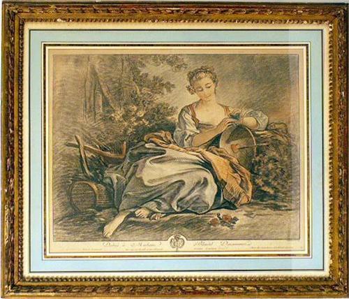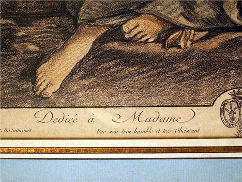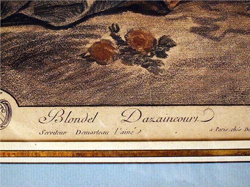Titled "Dedice a Madame Blondel Dazaincourt", by Gilles Demarteau (French, 1722-1776). Losses. 14"h x 18"w.