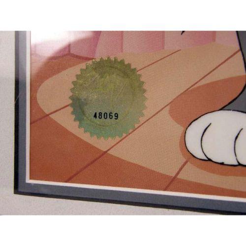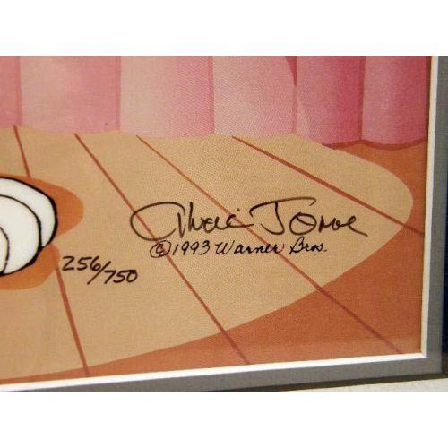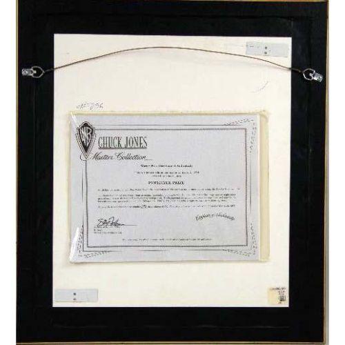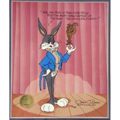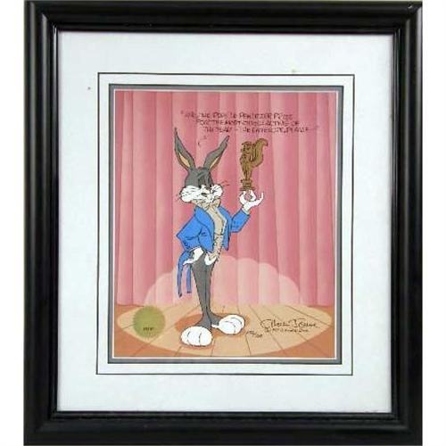 A FRAMED HANDPAINTED CEL<BR><BR>Depicting Bugs Bunny, bears signature l.r. Chuck Jones, 1993 Warner Bros. 256/750, bears seal of authenticity #48069, certificate of authenticity on verso, 12"h x 10"w