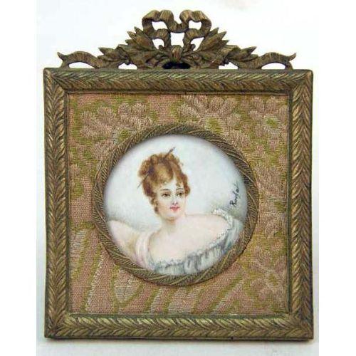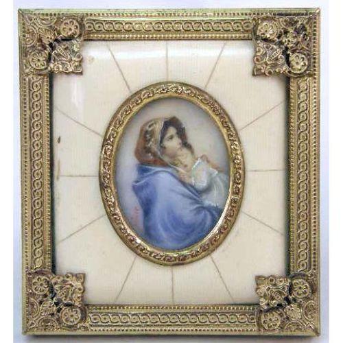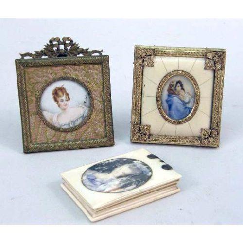 A FRAMED MINIATURE PORTRAIT OF A LADY ON BONE<BR><BR>with illegible signature. Together with a framed miniature of a mother and child and a bone hinged box with faded portrait. 3 3/4"h x 3"w 3 pieces.
