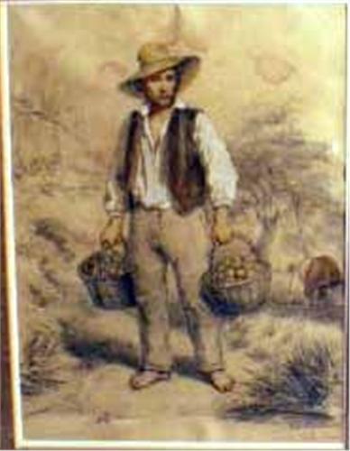 Man holding baskets of potatoes, bears signature lr "Miss Plunkett (Irish)" and "Guinley House". Some very minor tears and folds. 9 1/2"h x 7 1/4"w.