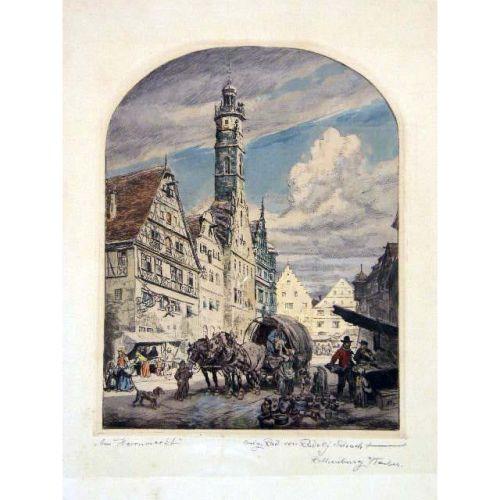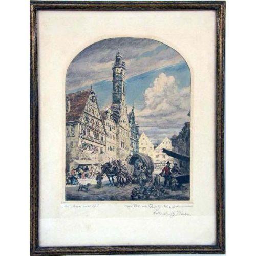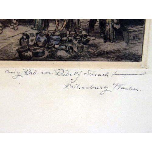 A FRAMED MIXED MEDIA<BR><BR>Depicting a street scene, bears inscription, "Original Rad von Rudolf Schacht Rothenburg/Tauber" (1900-1974) 14-1/4"h x 10-3/4"w