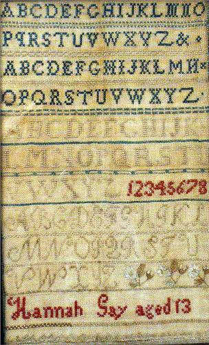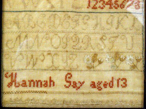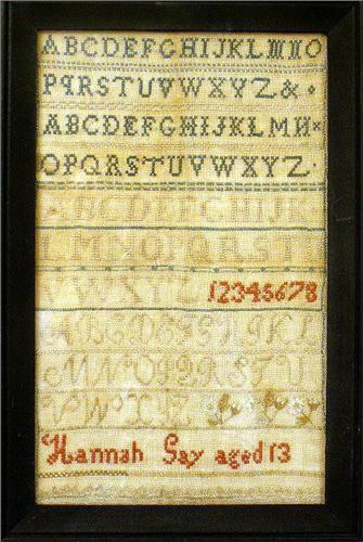 Alphabet and numbers above the inscription "Hannah Gay aged 13". 11 3/4"h x 7"w.