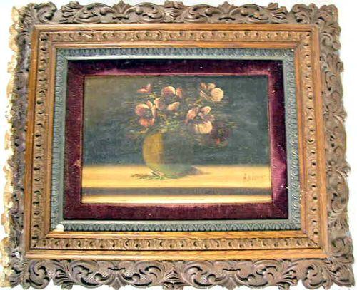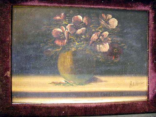 Depicting a floral still life, bears partially legible signature lr A.D. Verkl(?), the verso fitted with a small paper label inscribed in ink "Property of Elta M. Deufeld". Surface imperfections and craquelure, heavy losses to frame. 9"h x 13"w.