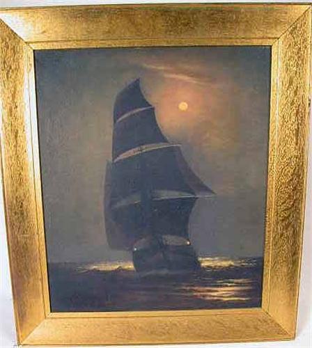 Depicting a clipper ship at full sail under a moonlit sky, bears signature ll "A.B. Boyce". Sightline 17 1/4"h x 14 1/2"w.