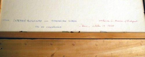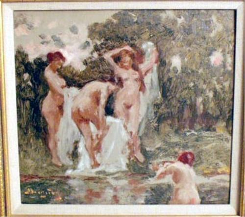 Depicting four female nudes, bears signature ll Istvan Bosznay (Hungarian, 1868-1944), the verso inscribed "Istvan (Stefan) Bosznay, Hungarian school, b. Oct. 19, 1868". 10"h x 11"w.