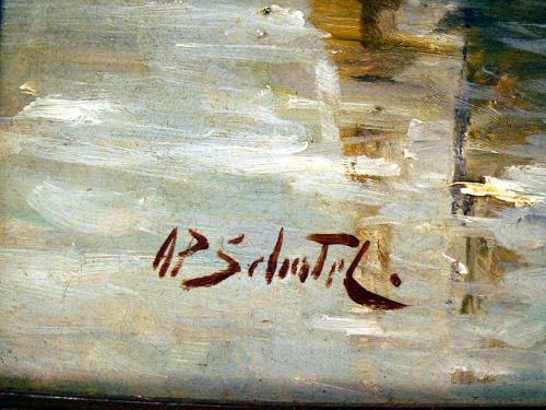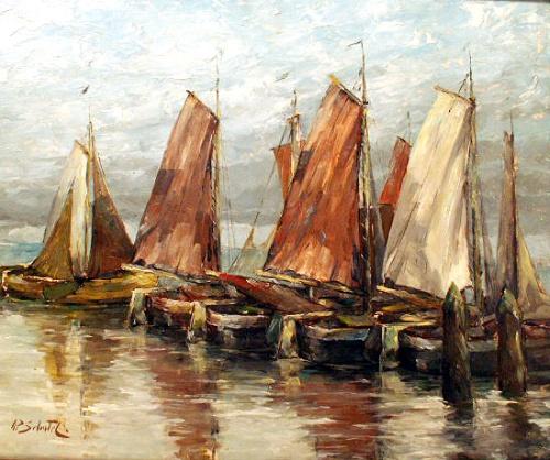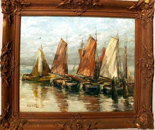 Depicting moored sailboats, bears signature ll A.P. Schiatil (sp?). Some losses and repairs to frame. 18 1/2"h x 22 1/2"w.