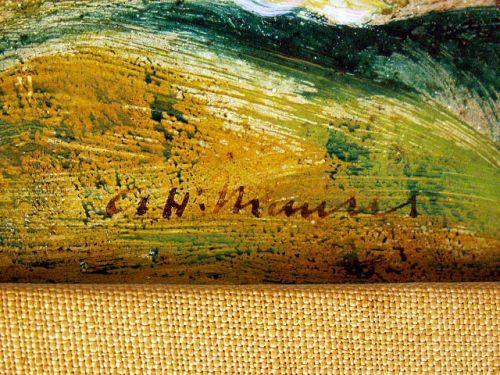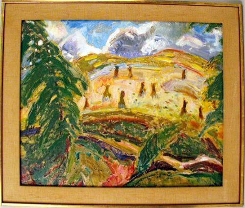 Depicting a polychrome abstract landscape, titled "Cornfield Landscape, c. 1912", bears signature lr Alfred H. Maurer (American, 1868-1932), within a Kulicke frame. The painting is included in Elizabeth McCausland`s book "A.H. Maurer" on pages 175 and 1