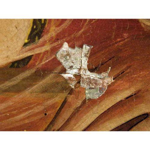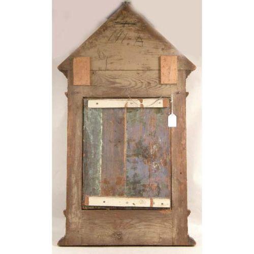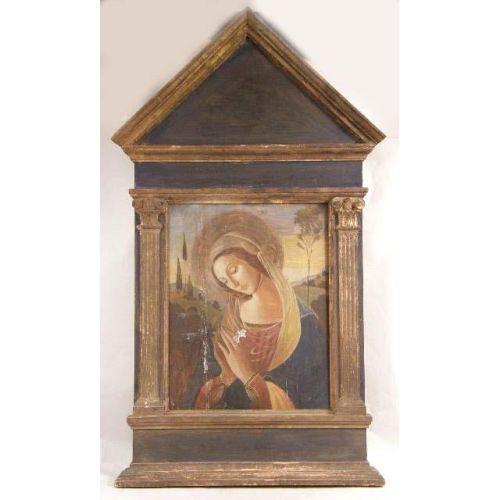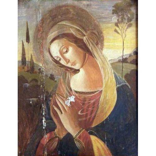 A FRAMED OIL ON BOARD<BR><BR>Depicting the Virgin Mary, mounted in a cathedral-shaped frame, losses, 22"h x 17"w