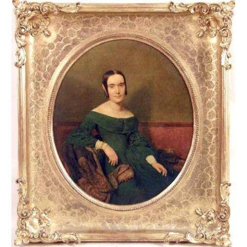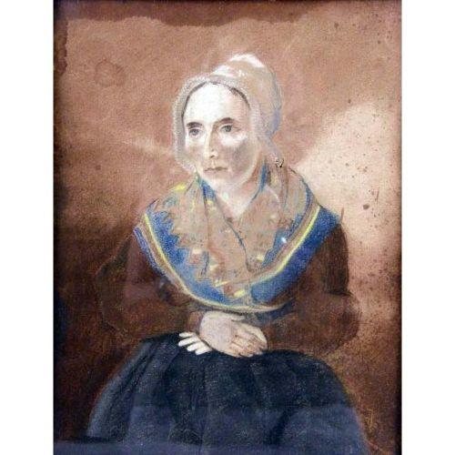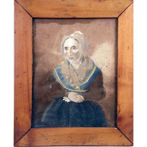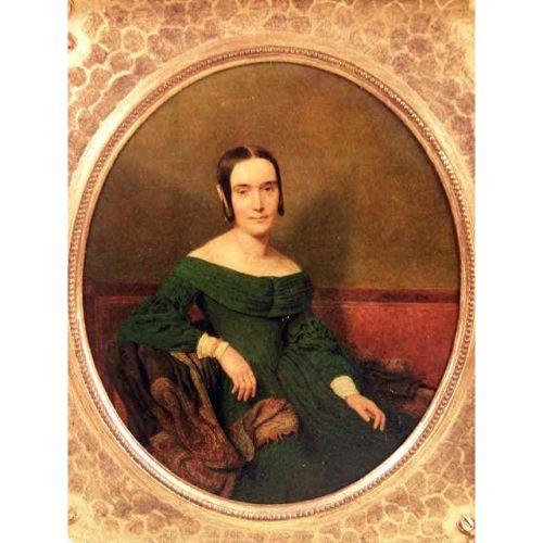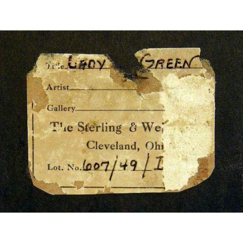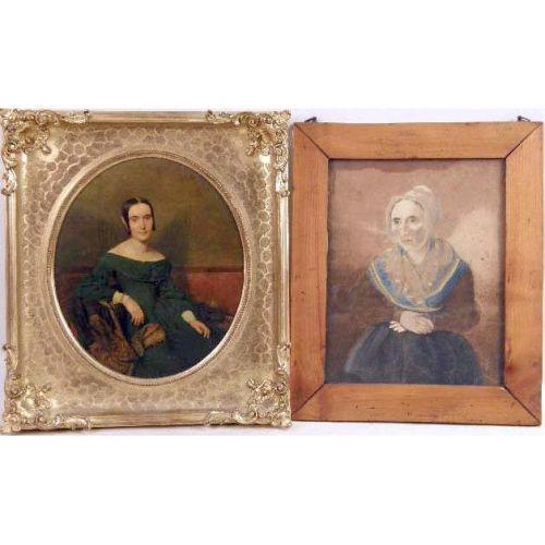A FRAMED OIL ON BOARD<BR><BR>Titled "Lady in Green", young woman seated with paisley shawl, traces of label on verso with gallery label "The Sterling and We... Cleveland, Ohio", 11-1/2"l x 10"w. Together with a framed pastel portrait of a woman, water damage and wear. 2 pieces