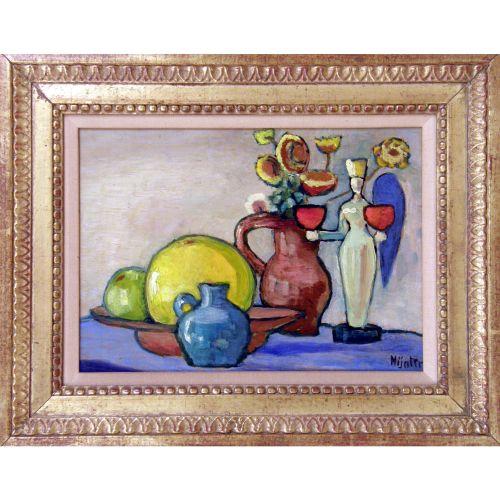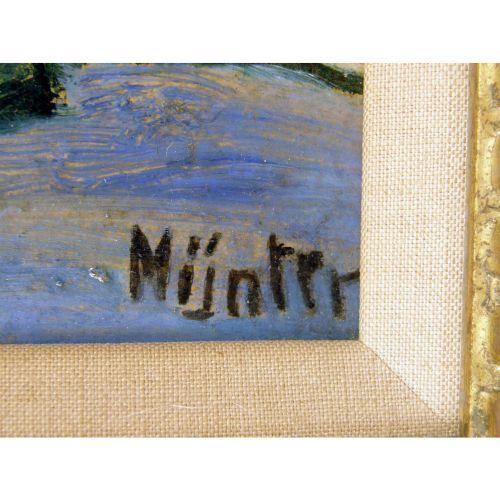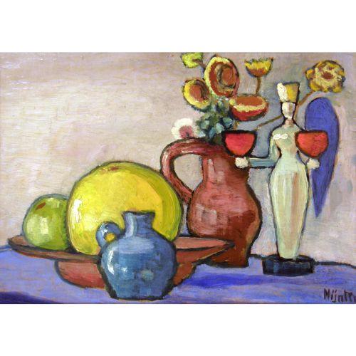 A FRAMED OIL ON BOARD<BR><BR>a polychrome still life, bears signature l.r., Munter, (Gabriele Munter, 1877-1962), 9-1/2"h x 13"w. The Blue Rider (Der Blaue Reiter) was a German Expressionist movement first established in December, 1911 by Wassily Kandinsky, Franz Marc and Gabriele Munter. The Blue Riders believed that colors, shapes and forms had equivalence with sounds and music, and sought to create color harmonies which would be purifying to the soul. Although in their very earliest works Impressionist influence was recognizable, the artists of The Blue Rider group were considered to be the pioneers of abstract art or Abstract Expressionism. Their work promoted individual attitude and broke free from any artistic restraints. The group`s motto, based on the precepts of the philosopher Friedrich Nietzsche, was "Who wishes to be creative must first blast and destroy accepted values." The first exhibitions of The Blue Rider included works by Kandinsky, Marc, Pablo Picasso, Paul Klee, Henri Rousseau, Robert Delaunay, and Arnold Schonberg. These artists, who early in their careers broke from the mainstream, were later to become the driving force behind modern art as we know it today. Main representatives of the group are the artists Kandinsky, Alexei Von Jawlensky, Paul Klee, Alfred Kubin, Marc, August Macke and Munter.