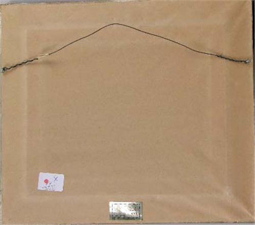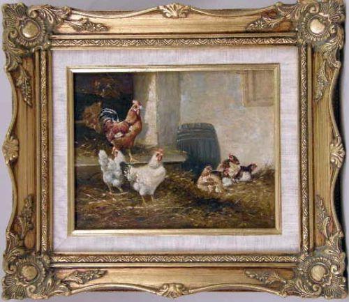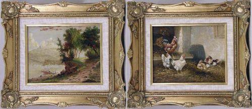 Depicting roosters and chickens. Unsigned. Together with a framed oil on board of figures in a landscape, unsigned. 2 pieces. 7 1/2"h x 9 1/2"w and 7 1/2"h x 9 1/2"w