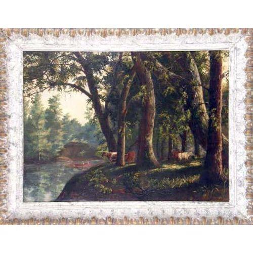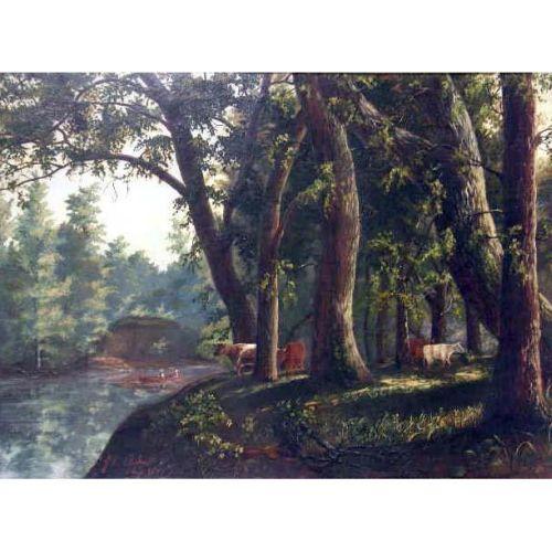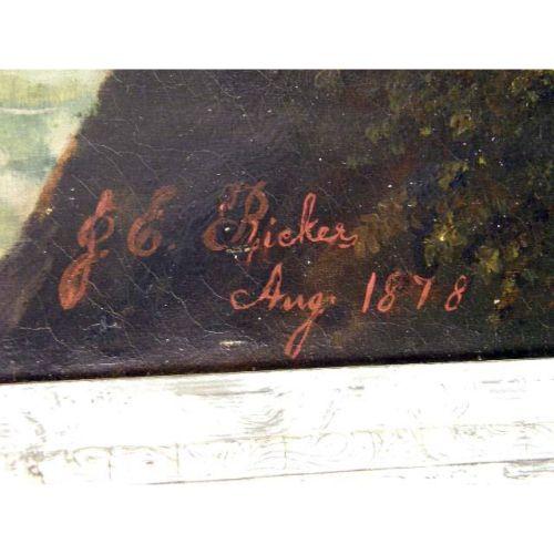 A FRAMED OIL ON CANVAS OF A BUCOLIC RIVER<BR><BR>With cattle in the foreground, bears signature l.l. "J.E. Ricker (?), Aug 1878," 21"h x 30"w