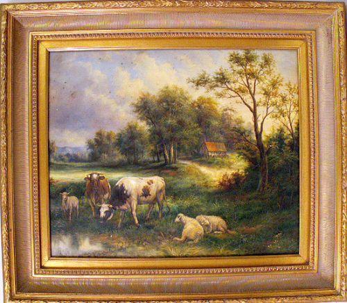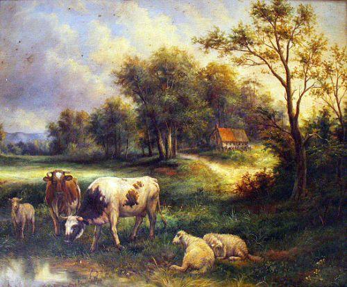 Depicting a landscape with sheep, bears signature lr Taylor. 19 1/2"h x 23 1/2"w.