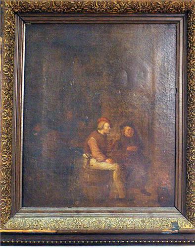 Depicting men in a tavern, attributed to E. Van Heemskerck. Overall craquelure, repair upper right, chips to frame. 14 3/8"h x 12 1/4"w.