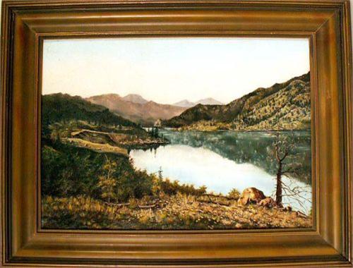 Depicting a mountain lake landscape, bears initials ll (possibly) L.S.S. 12"h x 17"w.